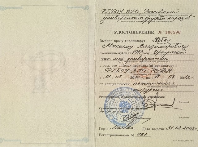 - 2010-2012 гг ординатура по пластической хирургии в ФГБОУ ВПО РУДН