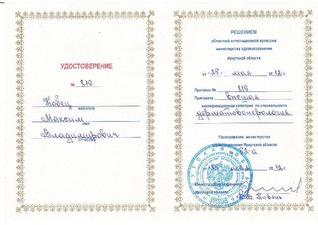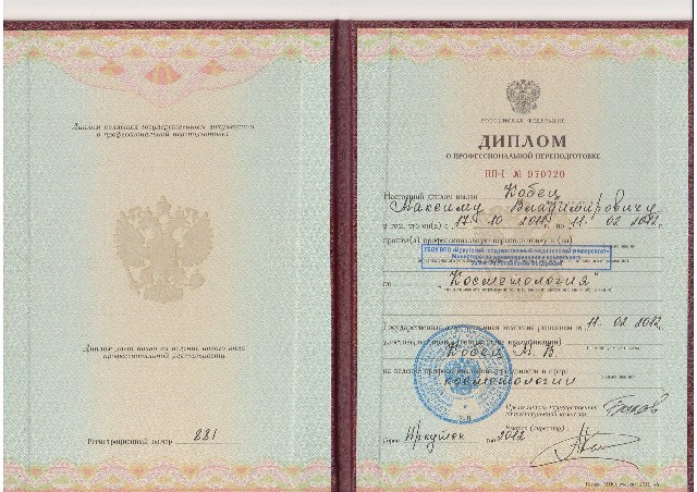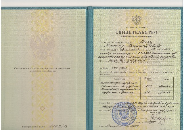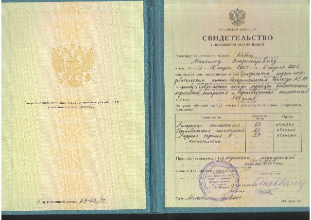 - В 2009 году прошел дополнительно повышение квалификации по лазерной хирургии (144ч) в Г.О.У.Д.П.О. Российской мед. академии после дипломного образования Росздрава.