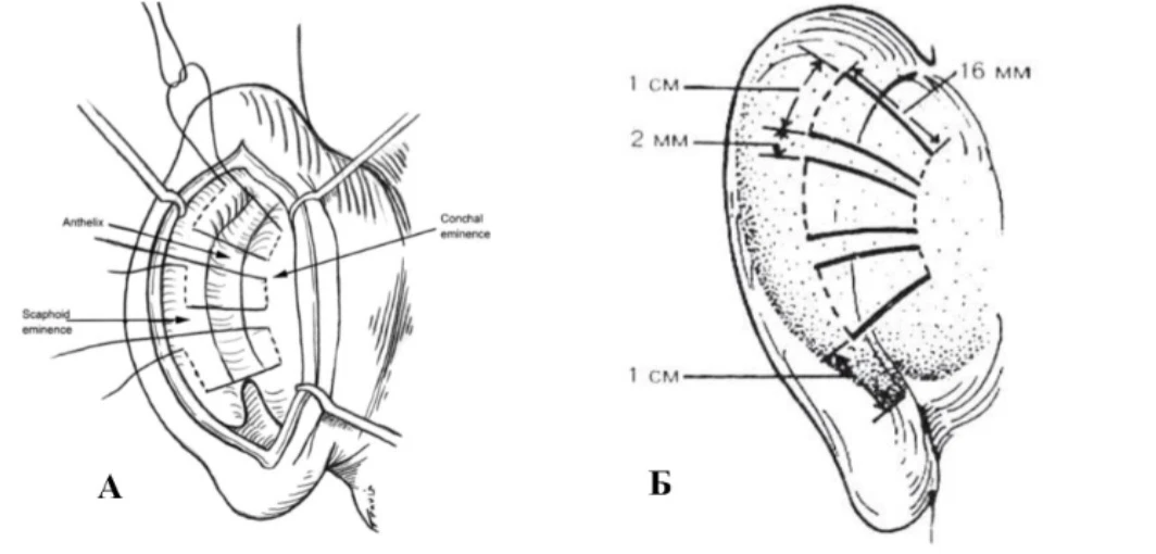 1.Техники коррекции ушных раковин с отстоящей чашей и сформированным противозавитком, направленные на уменьшение высоты чаши путем иссечения части хряща или фиксации его к надкостнице сосцевидного отростка.