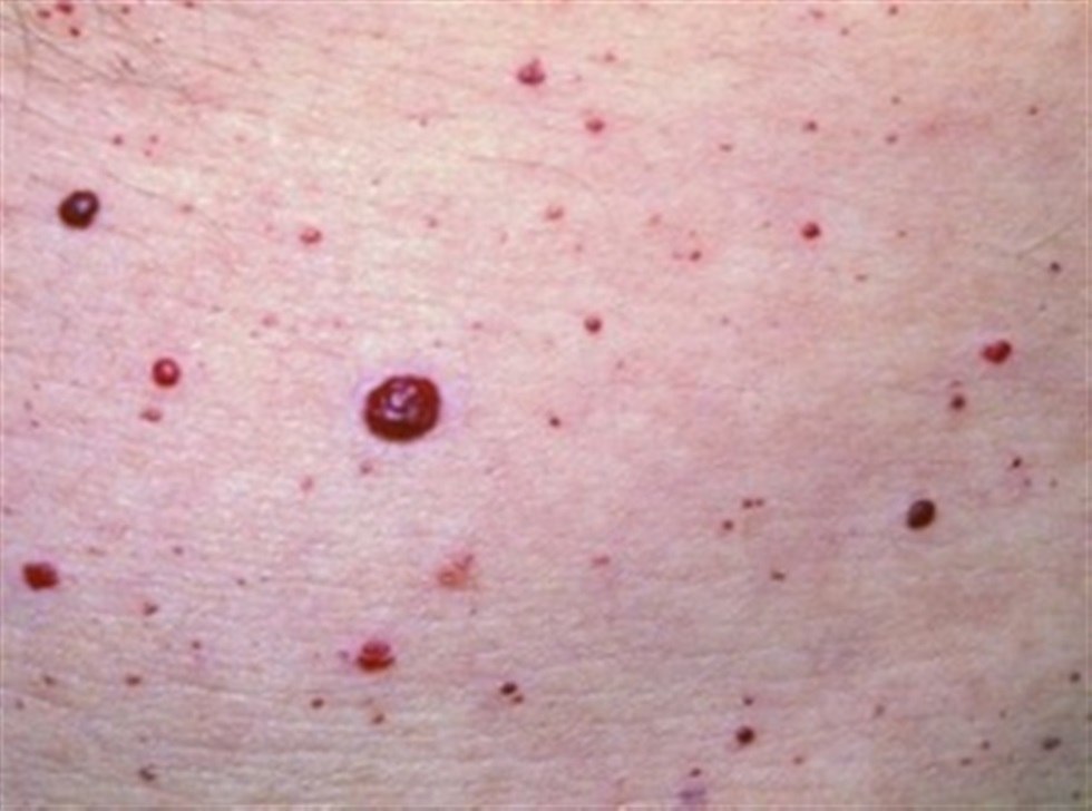 Гладкий узелок красного цвета, образовывающийся на коже. Чаще всего сенильные гемангиомы появляются на туловище, но их возникновение возможно и на коже других частей тела. Причина появления сенильных гемангиом неизвестна, чаще всего такие узелки возникают на коже людей, достигших сорокалетнего возраста.